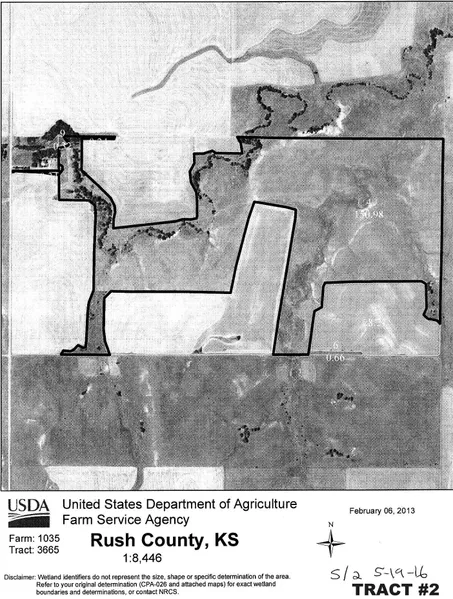 Tract #2: S/2 5-19-16, Rush County Land, less and except the 5.6364 acre farmstead tract, consisting of 307 acres, more or less. 155.5 Cultivated Acres. Balance in Pasture and barn. Pasture and crop land is cash leased thru August 2013. 77.0 acre wheat base, 32 yield. 40.8 acre grain sorghum base, 42 yield. 2012 Taxes Were $594.00
