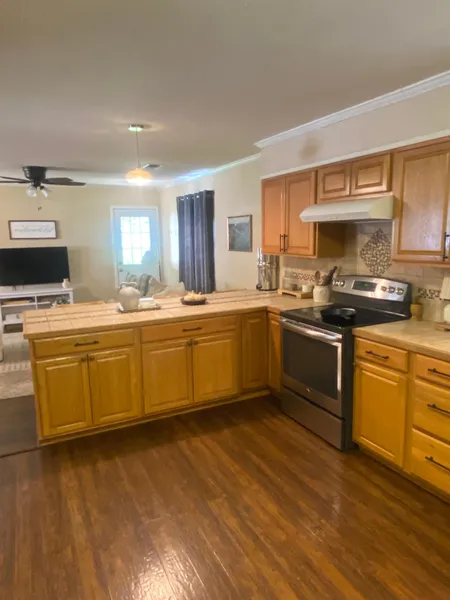 This is a 3 bedroom, 2 bath home with wood grained flooring in the den and kitchen. The bedrooms have the original wood flooring, while the baths are both tiled. The kitchen is very roomy, 14 feet x 12 feet, and has plenty of countertop space as well as cabinetry. A double kitchen sink with a window above is perfect for letting the light shine in! A long bar separating den and kitchen can be used as an informal dining area, or the ideal spot for kids to get that homework done! The laundry room is located in the center of the house making access convenient from all bedrooms.
