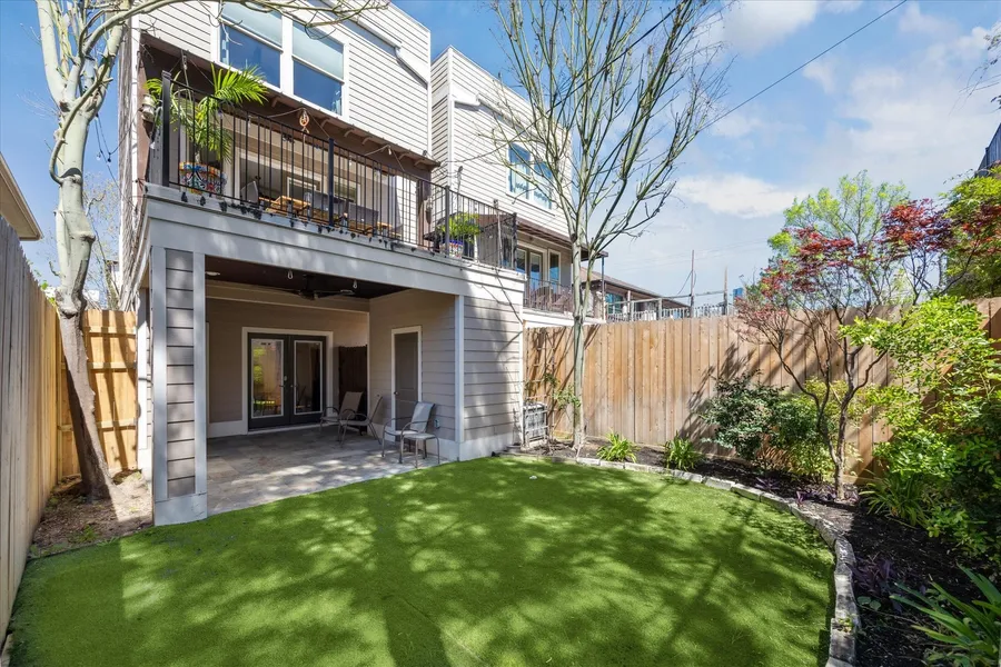 Enjoy stylish city living at its best in this spacious 3/3.5 Midtown patio home featuring outdoor entertaining space on 3 floors, including rooftop patio with stunning skyline views and turfed ground floor garden with covered stone patio and recent privacy fence. Great curb appeal with low maintenance landscaping. Gated side patio leads to inviting entry hall with stone floor plus ensuite bedroom/flex space. Open plan, light-filled 2nd floor living with high ceilings, gleaming hardwoods and half bath with stone wainscotting offers lots of options for furniture placement and flows seamlessly through French doors to expansive, partially covered terrace perfect for alfresco dinner and cocktail parties. Chef’s kitchen with picture window showcases pendants, pantry, stone counters, tile backsplash, stainless appliances and large island incorporating gas range. Generous primary suite with 2 walk-in closets, 2 sinks, jetted tub and walk in shower. Utility closet with full size stacked w/d.