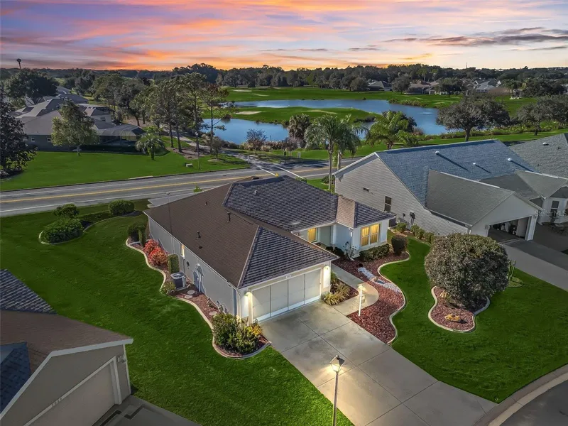 Stunning Custom 2/2 + Den Concrete Block and Stucco Carolina III/Sun Kissed model with a 2 Car Garage, Golf Course, and Pond View in the sought after location of the Village on Glenbrook, conveniently situation minutes from Lake Sumter Landing, and Spanish Springs Town Square, where you can enjoy nightly Entertainment 365 days a year! BOND PAID! This Exceptional home offers a Charming 16 x 6 Covered Front Porch, an Open and Split Floor plan, Vaulted ceilings, Whole House Water Softener, a Den with Archway entrance off the Dining area, and a Glass Enclosed Lanai. Upon entering this lovely home, you are greeted by the Living and Dining area combination featuring Vaulted ceilings, and Gorgeous Newer Luxury Vinyl Plank flooring! The Open Concept Floor Plan creates a Spacious Gathering area, Perfect for Entertaining Family and Friends! The Dining area flows seamlessly through sliding doors to the Glass Enclosed Lanai adding a Fantastic Additional Living Space flooded with Natural Light, and accesses the nice size Pergola Covered Back Patio, Enhancing the Outdoor Living Experience! The Open Kitchen showcases Granite countertops, Cabinets with Pullouts, Stainless appliances, New Dishwasher 2025, Refrigerator & Stove 2021, Pantry closet, GAS Hook Up Available for Range, and a Generous Breakfast Bar! The Split Floor plan offers Maximum Privacy for both the Owners and their Guest, with the Primary Suite commanding one side of the home, while the guest bedroom, Den, and bathroom are located on the opposite side of the home. The Luxurious Primary suite offers a Large Walk in Closet, and an En Suite bathroom. The En Suite bathroom features a New Marble Vanity, and a New Walk in Shower. The 22 x 20 Two Car Garage provides plenty of room for storage! Roof 2018 by Sacks Roofing, HVAC 2018 by Munns, This Charming Sun Kissed model is conveniently located near the Savannah Sports Pool and Regional Recreation Center, Hilltop Executive Golf Course, Glenview Country Club, El Santiago Executive Golf Course, and various recreational facilities, including Adult and Family Pools. In addition, you'll find plenty of Shopping Centers, Banking, Restaurants, The Villages Hospital, and the VA Center all just minutes away!