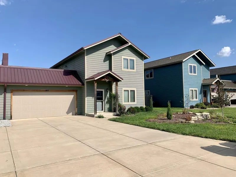 This beautiful 3 bed, 2.5 bath modern duplex sets just off Scenic Drive on the outskirts of Manhattan KS. This unit was built in 2014 with a spacious open floor plan. On the main floor, the entry way opens up into a living room featuring a gas fireplace with tile surround. The dining room includes double doors that open into a storage/office area including a large desktop. The kitchen includes white cabinets, stainless steel appliances and prep island and tiled backsplash with stained/sealed concrete countertops. Just off the kitchen is a hallway leading to a half bath, 2 car garage and fenced in back yard. All rooms on the main floor include stained concrete flooring making this home a breeze to keep clean. Heading upstairs you will find a master bedroom including a spacious walk in closet and master bathroom with walk in shower. The other two rooms and bathroom are located down the hallway. All the bedrooms and hallways are carpeted on the second and the bathrooms have hardwood flooring. The laundry room is conveniently located between rooms. From the upstairs there is an exit onto the scenic rooftop patio that sets on top of the two car attached garage. This great home is ready for new owners!