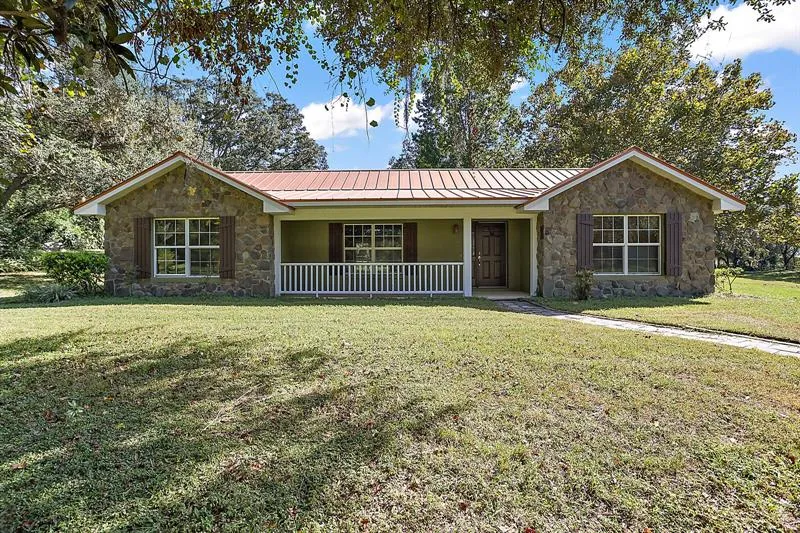 25 (+-) ACRE CROSS-FENCED EQUESTRIAN ESTATE WITH 3/2 HOME AND 10 STALL HORSE BARN. Welcome home to this beautiful property located in sunny Central Florida, just close enough to the Orlando International airport, coveted beaches, famous theme parks, dining, and shopping. Lush, gently rolling pastureland surrounds you. 25 acres of beautiful land, graced with majestic moss-laden Oaks and coupled with the soothing sounds of nature, makes this an idyllic, tranquil haven and the perfect place to call home. There are many ideal uses for this acreage, but it is currently set up with a 60 x 84 block barn encompassing 10 horse stalls, tack room, feed room with half bath, roll-up door, and metal roof with ridge vents for ventilation. The barn is equipped with a fly system and fans in each of the stalls. There are 4 pastures, fenced and cross-fenced, as well as a clay arena. Leave the stresses of your day behind as you make your way down the gently winding lane to arrive home at this custom built by Hegstrom Home Builder with charming stone facade, a gabled roofline with stunning copper roof, and a welcoming front porch that beckons you to sit for a minute or a while and enjoy the serenity of nature. Inside is a well-designed, split bedroom floor plan with vaulted ceilings, open concept living areas, and consistent finishes throughout, including all tile flooring and a pleasing neutral color palette ready for your personal touches. This home is well-maintained and completely move-in ready??host family and friend gatherings in the open living, dining, kitchen area. Enjoy the high ceilings and a well-appointed, attractive kitchen with custom wood cabinetry, granite counters, stainless appliances, pantry, large breakfast bar, dining area, and glass slider to the expansive covered rear lanai. The kitchen and owner's suite have direct access to the laundry room, complete with sink, cabinetry, hanging rack, and outside access door. The owner's suite offers large windows, a walk-in closet, a private en-suite with a dual granite sink vanity, and a tiled shower. Two guest bedrooms share a full hall bathroom with a tub/shower. Relax or entertain on the rear lanai while enjoying the peace and beauty of your land. What a fantastic property offering privacy, peace, and possibilities.