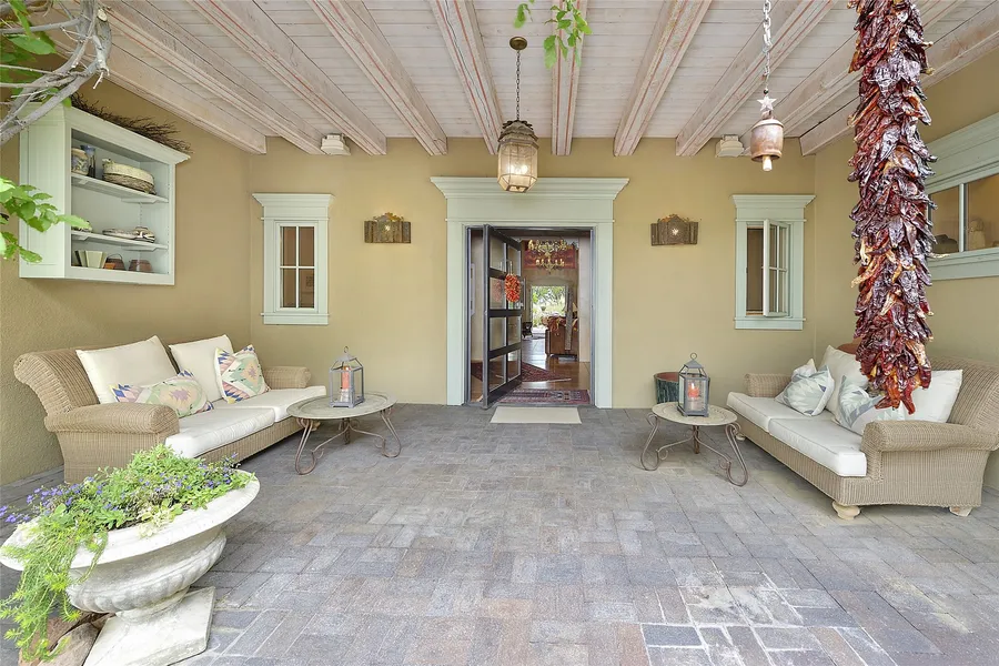This classic Northern New Mexico style home is a must see. The home has outstanding finishes and quality of construction with all of the touches that make Santa Fe homes so charming. Thick pumice-crete walls, high ceilings, hand troweled plaster, carved beams and Territorial details abound. Situated on a quiet ridge-top just minutes from Eldorado shopping and a short drive to the Santa Fe Plaza, this 9 acre estate offers luxurious country living and city proximity. The property has mature pinon and junipers throughout and beautifully landscaped gardens in various courtyards, many with water fountains and features. The chef's kitchen will delight any cook with professional appliances and is great for casual entertaining around the custom made island next to a counter height fireplace. The light-filled dining, living and family rooms open through multiple french doors to a deep wrap around portal with an outdoor fireplace and fountain. You will be able to enjoy sunsets and sunrises along with panoramic views of Sangre de Cristo, Jemez, and Sandia mountains. The luxurious and spacious main suite with a large bathroom, steam shower, walk in closet, and private north-east facing garden/courtyard with water feature will be a great retreat. All guest bedrooms are spacious with ensuite baths, and extend off a lovely window lined hallway gallery overlooking the main courtyard. A two-story media room/casita at the end of the hallway with a balcony can serve as a perfect care-taker's quarters, guest accommodations or studio. The heated, 3-car garage/greenhouse with glass roll-up doors could also serve as a wonderful studio or workshop.