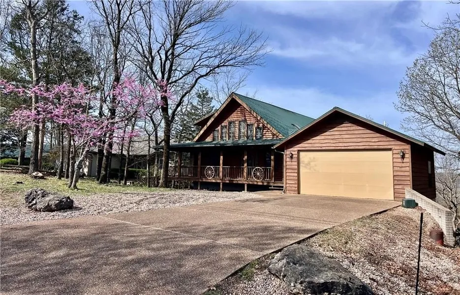 Cozy log cabin home with beautiful views of Table Rock Lake. This home features a 2 car garage, wrap around decks, double sided fireplace, sunroom, 2 living rooms, sitting area with built ins just outside the primary suite, new HVAC system in Feb. 2025. Holiday Island assessment fees due yearly. This property is SOLD AS IS.