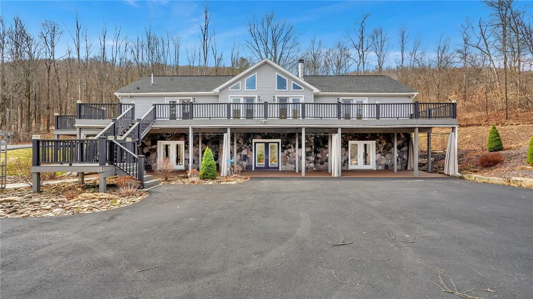 Looking for privacy? This custom built home offers it all! Cross the bridge that leads to this seclusion. Entry to the main floor conveniently through the side door with ramp for easy access or from the 70 ft. front deck. The living room boasts of style with cathedral ceiling and gas fireplace with full length windows and doors. An open floor plan to kitchen with stainless appliances has a breakfast bar and roomy dining room. Spacious Family room w/cathedral ceilings, full wall windows and built in shelving. French doors to rear deck and patio. The Master Suite offers access to deck, walk in closets and a beautiful Master bath with large glass shower. Guest bedroom w/bath and access to deck. An additional bedroom, 3/4 bath and a laundry room. Radiant heat throughout this home. The first level has 3 French doors to enter and features abundant living space with a bedroom, 3/4 bath and plenty more space for game room, office or workshop. Detached 60 x 50 garage with 1/2 bath, radiant floor heat and separate sewer system. Home is Handicap Accessible.