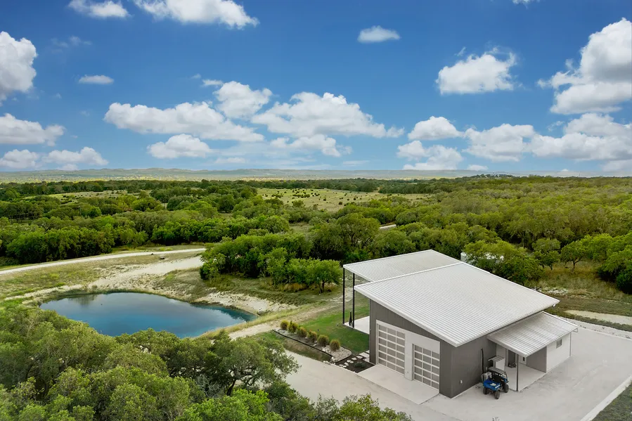 Exceptionally versatile acreage with modern casita and 2400+/ sf barn offering a perfect blend of Hill Country adventure, agricultural use, and private tranquility just 45 minutes to Austin or San Antonio. Explore the trails on mountain bikes or ATVs, practice your swing from the Tifway 419 tee box, grow an orchard or vineyard, keep chickens horses or livestock, or just enjoy the hill country breeze overlooking the pond. Cinco Blanco Ranch is an easily maintained 31.5 acres tucked away in the Hills of Madrone, a relaxed ranch community, where you'll find an exquisitely designed 1200+/- sf contemporary casita and barn/workshop. Geared toward entertaining, the casita brings the outdoors in with expansive windows, sliding doors and covered decks and features artisan touches such as a floating hickory stair case and Level 5 drywall finish for a clean and modern feel. The perfect complement to the residential footprint is the 2400+/- insulated, temperature controlled multipurpose building that may be utilized as a garage and workshop, or easily configured to facilitate other purposes coupled with (2) 50amp RV hookups located on the interior and exterior of the barn/workshop including cleanout, plus 10 and 12 towering roll up doors. Optimally efficient, the improvements are wrapped in foam insulation and are supported by a 30k gallon rainwater harvesting system. Truly an ideal ranchette for an owner who desires to immediately enjoy their property and potentially build their main residence now or in the future.
