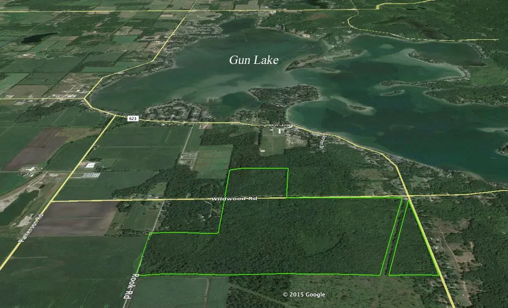 From US-131: Shelbyville Exit #59 124th Ave. Go east through Shelbyville toward Gun Lake. South on Patterson Rd, east on Wildwood Rd. Subject is located on the north and south side of Wildwood Rd between Rook Rd & Marsh Rd. Refer to aerial photograph.
