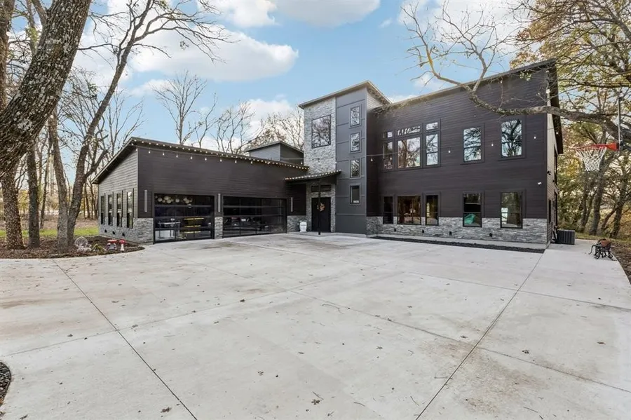 Welcome to an unparalleled masterpiece where modern luxury meets serene sophistication on 2.47 acres backing a private creek. This custom-designed smart home redefines elegance with soaring ceilings, Woodland Reserve Creekside Sawn White Oak wire-brushed hardwood floors, and quartz countertops throughout. The chef’s kitchen boasts Zline appliances, including a 48” propane stovetop with double oven, 30” wall oven and microwave, double dishwasher, and under-cabinet beverage fridge, complemented by waterfall quartz countertops and matching backsplash. Two 32” KRAUS Bellucci granite composite sinks enhance functionality, while a walk-in pantry with a sink adds convenience. The main living area features a gas fireplace with built-in storage, a floor plug for flexible layouts, and a glass-enclosed wine cellar. Retreat to the master suite with a light-up ceiling, electric fireplace, and spa-like bathroom offering an Alpha bidet, dual shower with rain head, skylight, and stand-alone garden tub. Smart home technology, including Z-Wave switches, 5 alarm cameras, and 3 touchscreen control centers, allows seamless control of lights and thermostat. The media room, hidden behind a bookshelf door, boasts a 132” projector screen, 8K Ultra-HD receiver, and MartinLogan speakers, plus a beverage fridge and private balcony. Outside, a wood-burning fireplace warms the back patio, joined by an outdoor kitchen with a Traeger Timberland XL and kegerator. Titanium black quartzite stone, cedar siding, and black modern pebble landscaping frame the shingle-roofed estate, with a 3-car extended garage and custom black-trim windows. A 1,260 sq ft metal building with an 840 sq ft porch, pre-plumbed for a bathroom, offers endless possibilities. Experience luxury living with unmatched privacy and creek views. Schedule your private tour today!