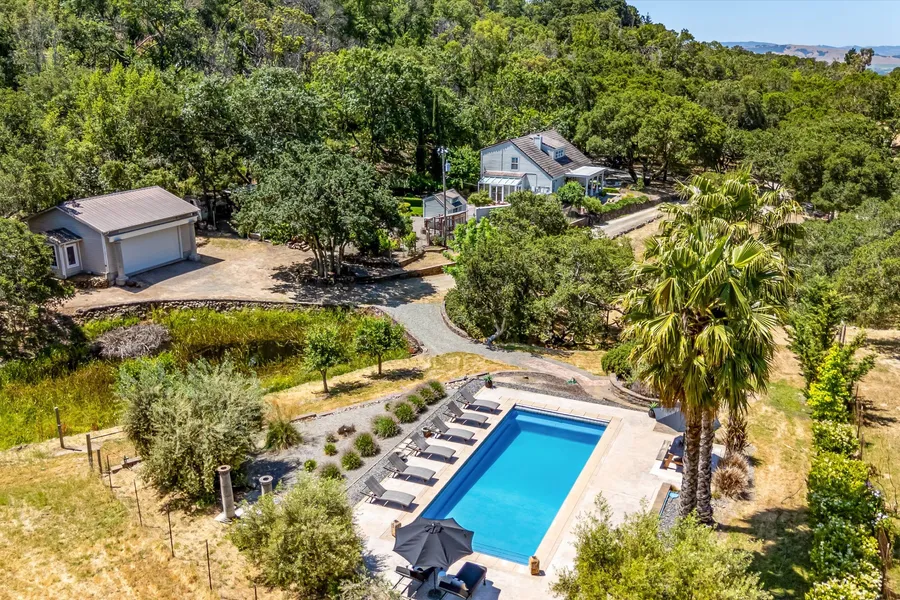 Tucked behind a private gate in Sonoma's coveted eastside hills just minutes from the historic Plaza yet worlds away, this 5 acre Wine Country retreat offers the ideal blend of relaxed entertaining, sustainable living, and modern homesteading. The main home features 3 bedrooms plus an office, 2 baths, vaulted ceilings, hardwood and travertine floors, and a spacious kitchen with a large island perfect for preparing garden-to-table meals and hosting friends and family. Designed for self-sufficiency, the property includes a high producing well, septic system, solar panels with Tesla battery backup, pond and seasonal creek. Raised garden beds, a chicken coop, greenhouse, and 12 olive trees harvested for estate olive oil provide the foundation for a true farm-to-table lifestyle. Entertain in style at the open-beamed Wine Pavilion, unwind in the sunroom with views of curated gardens or explore secret nooks around the property. Pastures once vineyard, now for crops or animals. Additional buildings include an ag barn with temp-controlled wine storage, Barrel Room with vintage wooden doors, the Oak Cottage ideal for an art studio or yoga, and a three-car carport with additional storage. A solar-heated saltwater pool completes this soulful, sustainable escape.