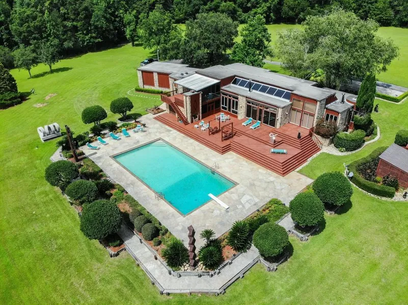 If you are looking for a one of a kind property then look no further! Contemporary Cypress and river rock custom home sitting on 95 +/- of the most well manicured acres around. About 1/4 of the property is beautiful open field and the remainder is heavily wooded mature hardwood timber. The custom home has 4 large bedrooms and 3.5 baths. Master bedroom is on the main level and has a fireplace, whirlpool tub and separate shower. 3 bedrooms upstairs with living and dining room on main level separated by a free standing wood burning fireplace overlooking the 57x20 gunite pool. The pool is surrounded by a large wood patio, grill, outdoor shower and screened porch. There is an office, home theater room and 2 car garage. The Cypress ceilings range from 9-19'. There is a separate barn and plenty of room to land a helicopter. The home is perfect for large family gatherings or entertaining business clients. Contact Sean Brown or Dennis Stallworth to schedule a showing of this magnificent property. Notes: Seller reserves: extensive art collection, fountain and art sculptures, totem pole. Owner must be present to open gate and operate home theatre system. To view a 360 degree tour of this magnificent home please CLICK HERE!