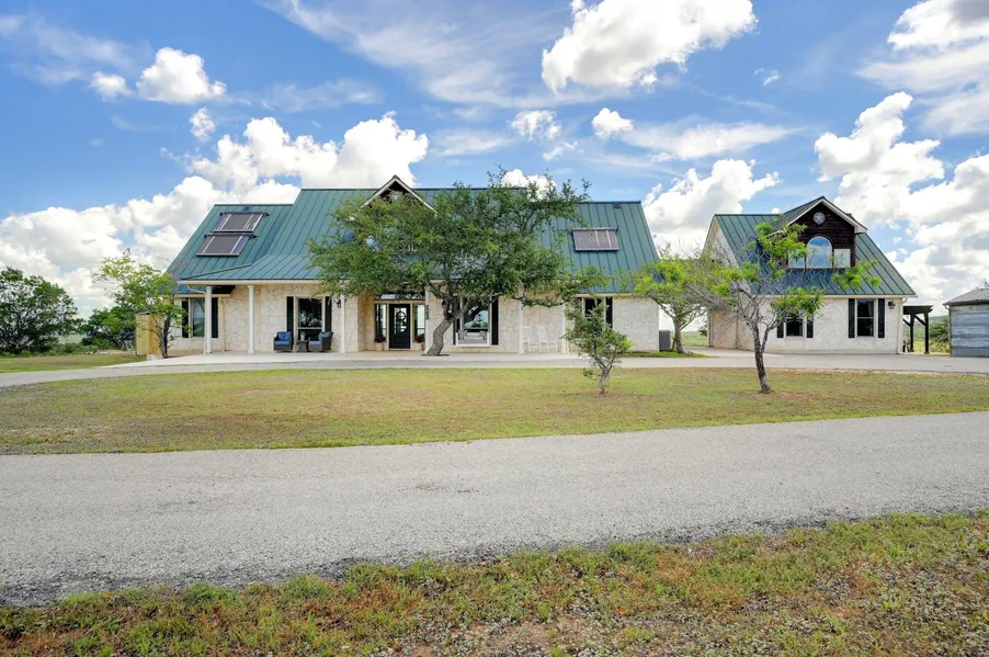 One of the Hill Country's finest jewels, nestled on top of a hill overlooking impeccable panoramic views and amazing sunsets! This fenced and cross fenced, 4,200+ square foot, 10 acre, 4 bedroom, 2 bathroom home with a Casita including two large living areas and a full bathroom for your guests is waiting for you! Enjoy entertaining in the gourmet kitchen that overlooks the dining area and views with its grand island, quartz countertops, newly painted kitchen cabinets, butler's pantry, six burner gas stove with griddle, and much more! The open kitchen, living room and dining room boasts oversized windows for beautiful natural light. Enjoy dinner with your guests under those windows while watching the sunset. The upstairs flex space with a kitchenette/wet bar along with an additional room can be used as an office, sitting room, or a third living area. Relax in the master suite with access to the back porch and enjoy the newly remodeled master bathroom with an amazing walk in closet made especially for the organizer. Your outside oasis includes an in ground pool with a pool bench surrounding the entire pool, hot tub, covered cooking area, pergola, large slab seating area and a cantina to enjoy. This property includes a 2,000+ square foot barn, fully functioning chicken coop, hen house, and two storage sheds. Recent home and property upgrades include paved road/driveway, new AC units in the home, all new double pane windows, new waterproof flooring, new luxury countertops, new well house piping, new well pump, new UV rain water and RO filter system, all new pool equipment and all new exterior doors. With incredible views this solar and wind powered property comes with a rain water harvesting system, an 8,000 gallon cistern and a 40,000 gallon water catchment storage tank. The property backs up to a 2,800 acre ranch. This is a TRUE TX Hill Country property!