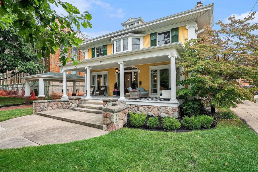 Step into a piece of history with the iconic Whitmer House, a two-story treasure nestled in the heart of downtown Goshen. This historic masterpiece effortlessly combines old-world craftsmanship with modern comforts, offering 4 generously sized bedrooms and 2.5 baths. With stunning mahogany woodwork, a graceful rounded stairway, white oak floors, and exquisite mosaic tile accents, every corner of this home speaks of timeless elegance. The inviting vestibule, with its beautifully detailed leaded glass windows, welcomes you inside, where you’ll find pocket doors, a marble vanity, and rich brass electric and gas light fixtures—each detail adding to the home's historic charm. A formal dining room, graced by a hand-painted mural by former owner, Lincoln J. Carter, sets the stage for memorable gatherings. The owner’s suite is a serene retreat, featuring an updated private bath, a dressing room, and a cozy den or private office—perfect for remote work or relaxation. The fully restored front porch serves as the home’s iconic focal point, inviting you to sit back and enjoy the views of your quaint brick driveway, which leads to a carport, further enhancing the home’s curb appeal. But the Whitmer House offers even more: a unique two-unit Carriage House, complete with two fully rented units (a 2-bedroom and a 1-bedroom), ideal for generating income or housing guests and extended family. Situated just steps from downtown, this extraordinary property is an unparalleled opportunity to own a piece of Goshen’s rich history, all while enjoying modern amenities and the potential for rental income.