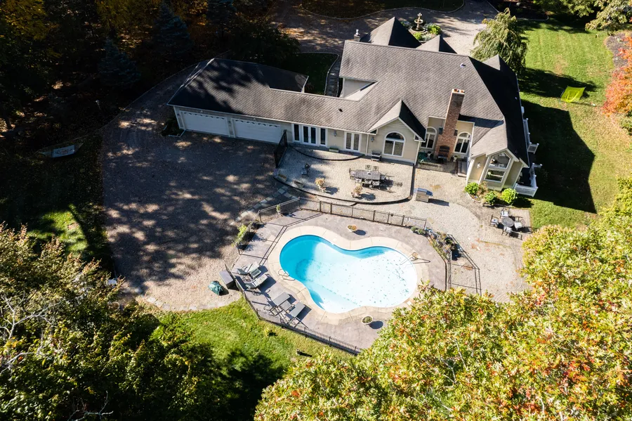 Luxurious mini estate tucked away and surrounded by nature. Custom built Cape with contemporary flair features an open floor plan situated on 11.14 acres backs up to state forest. The grand foyer leads you to the formal living room with fireplace. Paladin window and 16 foot ceilings in the formal dining room. First floor family room, den or office with gas fireplace, stained glass windows and ceiling fan. Chef's kitchen boasts custom cabinets, granite counters, huge island with built in storage, double ovens, Sub-zero refrigerator, Viking gas range, Bose dishwasher and wine cooler. L-shaped kitchen- open to bright, warm and inviting sun room with large area for informal dining, seating area and wall of glass. French doors leads you to stone patio. Relax and take a dip in the heated swimming pool. 1st Floor Primary bedrooms features a full bath and french doors to patio/pool area. 2nd floor Primary bedroom with California walk-in closet. Also, on 2nd level is the bonus room, limitless potential-this could be a game room, studio, etc. Four car garage with plenty of storage and space for workshop. Greenhouse has central air, heat and irrigation. Finished lower level makes a great rec room with over 1000 sqft of livable space. Over 1000 sqft of unfinished space over the garage. Sonos indoor/outdoor audio systems. New pool heater, pool liner, driveway, irrigation system, AC Units.