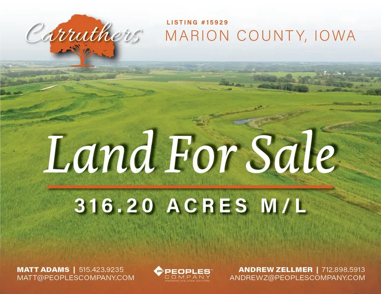 Peoples Company is pleased to represent the Carruthers family in the sale of 316.20 acres in southern Marion County, Iowa. Situated immediately along the Marion/Lucas County line and two miles southeast of Columbia, Iowa, this recreational property offers it all with heavily timber draws, two ponds, and income-producing opportunities.