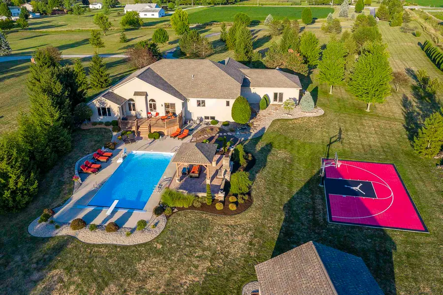 Opulent, lavish, and meticulously detailed, this lush estate home is a prized Dekalb County find. You are minutes to I69, 20 minutes to Fort Wayne, 5 minutes to Auburn and Dekalb Central middle and high school just through your backyard. Have you ever dreamed of having a private living area in your master suite? This has every luxury detail to satisfy the most sophisticated palates.The floor plan encompasses five spacious bedrooms with plenty of room for study, sleep and storage, three and a half luxurious bathrooms , and a sleek and stylish kitchen that flows through to the dining room and private rear patio with Broilmaster grill. The master suite is complete with walk-in his and her closets, built-ins, master laundry, bathing tub and vast tile shower ensures parents have a private space where they can enjoy. Never have to get up early to drive to the gym, this has its own custom workout studio complete with its separate HVAC, TV, and wireless Sonos system. Enjoy the lower level with full bar and family theater room and a second Sonos wireless whole home audio system. If this were not enticing enough...envision 6 1/2 stunning acres with an Air Jordan VersaCourt basketball court, in-ground heated saltwater pool with new power Coverstar cover, pool party building, a large Pavilion with fireplace and bar. Your very own resort awaits!! *Property has a brand new asphalt driveway that was completed 09/24/2020!!