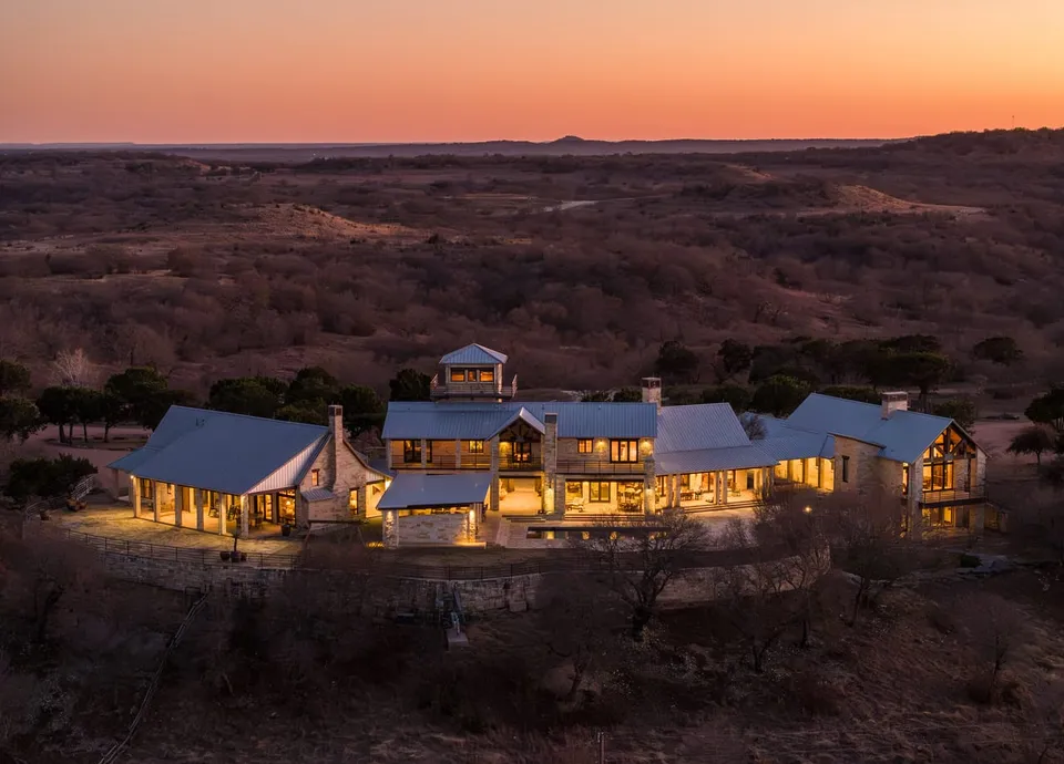 Middle Building (2008): Houses two guest bedrooms with full bathrooms, two half baths, a large kitchen with an island, an impressive fireplace centerpiece open on four sides, and two open living/ entertainment areas. A crow’s nest at the top provides 360-degree views. Outdoor amenities include a swimming pool, outdoor kitchen, propane fire pit, and a golf driving range.