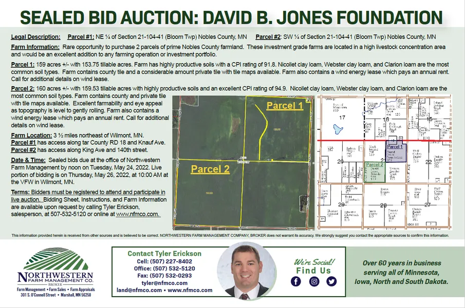 Date & Time: Sealed bids due at the office of Northwestern Farm Management by noon on Tuesday, May 24, 2022. Live portion of bidding is on Thursday, May 26, 2022, at 10:00 AM at the VFW in Wilmont, MN.