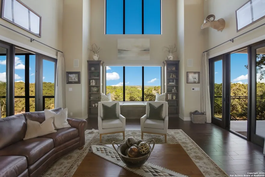 Outstanding, this Mattern and Fitzgerald custom residence is one-of-a-kind, located in the prestigious gated community of Copper Ridge. This property boasts a multitude of features that not only make it beautiful and sophisticated, but also efficient and top of the line. Among the many exclusive elements that make this residence unique are: *The location within the community, as the home sits in the aperture of the cul-de-sac (with the contiguous lot also for sale, allowing you to create a 2-acre estate). *Amazing views from any of the 5 terraces/balconies, including those on the main level, secondary and primary rooms, lower level, and the screened patio adjacent to the kitchen. The patio features a built-in grill and high-output burner, perfect for entertaining and enjoying the view. *The three levels are perfectly and seamlessly connected by an elevator, providing comfortable and effortless accessibility to every floor. *A 36 kW propane-fired generator capable of supplying electricity for the entire house for several days. *An indoor Swimex Pool that can be used as a hot tub. The room housing the pool is serviced by its own dehumidifier, AC, and water heater. *Two instant hot water heaters that are incredibly convenient when servicing several people at the same time. *Radiant floor heat in the owner's retreat and closet, as well as the bathrooms on the main level. *An exclusive and dedicated woodshop adjacent to the oversized 2-car garage (equipped with an additional 6' door and space for a golf cart). *Ample storage throughout the house, including the attic (with spray insulation), a storage room on the lower level, and a storage room off the garage under the front porch (serving as a tornado shelter). *Recent replacements of main systems, such as HVAC units, built-in refrigerator/freezer, and main water heaters. *A kitchen featuring white black leather granite and luxurious white marble countertops, high-end appliances (48" range with double ovens), a pot filler, and a butler's pantry. *The primary bedroom is a work of art, with a private balcony overlooking the Hill Country, a fireplace, and a spacious owner's retreat connected to a custom-built closet that also has access to the elevator. *Plantation shutters throughout the house allow the perfect amount of natural light, and remote-controlled electronic shades serve the grand room and front entry windows. *High-quality materials are present in every corner of this 5,450 square feet property, such as the rich and welcoming hardwood floors, the outstanding stucco and rock work, the long-lasting concrete tile roof, the breathtaking wood beams adorning the grand room, and the majestic semi-circular driveway, just to mention a few. *Though going almost unnoticed, the home is accessible for wheelchair use with 36-inch doors (including numerous pocket doors), a no-step entry from the garage, decorative grab bars in 4 of the 6 bathrooms, and roll-in access to the primary shower. *6-room surround sound system that can be controlled individually or in unison. Welcome to the Gem Of New Braunfels!
