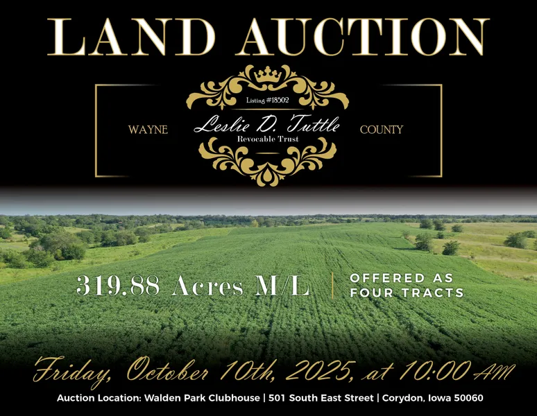 These tracts will be offered via a live Public Auction that will take place Friday, October 10, 2025, beginning at 10:00 AM at the Walden Park Clubhouse located at 501 South East Street in Corydon, Iowa. The land will be offered as four individual tracts and will not be offered in their entirety at the conclusion of the auction. This auction can also be viewed through the Peoples Company mobile bidding app and online bidding will be available.