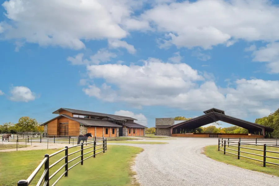 The climate controlled architecturally significant show barn mirrors the unexpected elegance with clean lines balanced against a rustic touch. Up to eight stalls with turnouts, two wash bays, rubber flooring, tack room, commercial bathroom, and full kitchen amenities ensure the facility can handle any occasion.