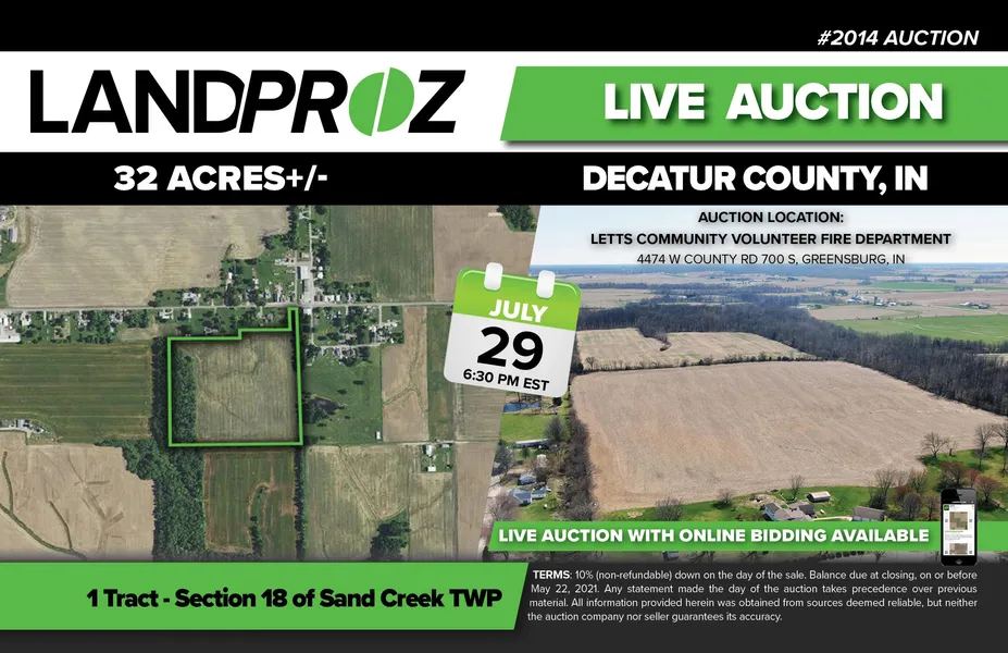 32+/- rolling acres in vintage Letts, IN. 24+/- acres are tillable with the remaining 8+/- acres made up of woods. The woods has various size timber and abundant wildlife. This farm has rural water at County Road 700 South. The Giles farm is in southern Decatur County. It is 11 miles from Greensburg, 21 miles from Columbus, and 22 miles from Batesville.