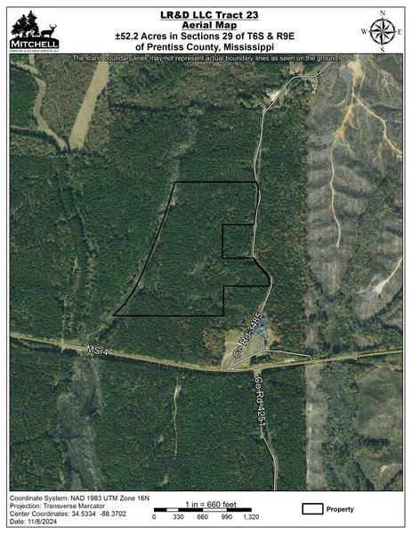 Tract 23 is a 52.2 acre tract with a potential house site or a hunting cabin alongside CR 3485 in Prentiss County. There is approximately 1,000 feet of county road frontage with power and water available. This property is located in a quiet and rural community just off of the south side of Hwy 4 3 miles East of New Site and 2.5 miles West of Bay Springs Lake. It is in close proximity to multiple public boat ramps and hunting areas, including John Bell Williams WMA, Divide Section WMA, and Canal Section WMA.