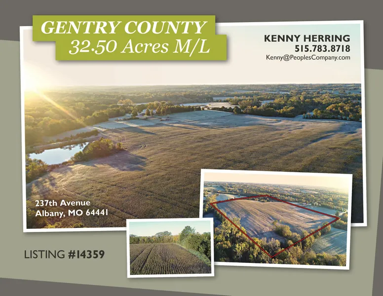 Offering 32.50 m/l acres of productive farmland in Gentry County, Missouri! This farm is nearly all tillable with 28.96 m/l acres currently in row crop production with soil types of Lamoni clay loam and Grundy silt loam. The remaining acres consist of timber and a nice pond built in 2002. This parcel offers multiple recreational opportunities with the income to justify the investment as well as a great location to build. The farm is currently cash rented providing a 4% return at asking price. Don't miss out on this prime opportunity to invest in a high quality piece of Gentry County farmland! Located in section 3 of Howard Township in Gentry County Missouri just southeast of Denver and only 12 miles north of Albany. Contact Peoples Company agent Kenny Herring to learn more about this fantastic property.
