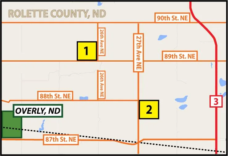 Research Parcel InformationDriving Directions: From Overly go east 3 miles on 87th St. NE to 27th Ave NE. Go north 1 mile on 27th Ave NE. This will bring you to northwest corner of Parcel 2. Continue north 1 mile to 89th St NE. Go west 1 mile on 89th St. NE. This will bring you to the southeast corner of Parcel 1.