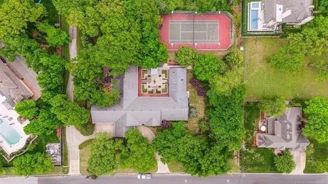 This rare Midtown Tulsa estate offers a once-in-a-lifetime opportunity on 1.38 beautifully landscaped acres. Designed for both elegance and enjoyment, the property features an indoor heated pool for year-round use, a fully lit tennis court for day or night play, and a stunning central outdoor courtyard that fills the home with natural light for every space. Expansive grounds, mature trees, and sweeping views of the neighborhood park create a private retreat right in the heart of the city.