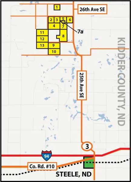 Directions: From I-94 Exit, #200 at Steele, ND, travel north on Hwy # 3 for 9.5 miles to 27th St SE. Then continue 1/2 mile west on 27th St. SE to the southeast corner of Parcel #7 and the northeast corner of Parcel #8. The remaining parcels are north, east and south.