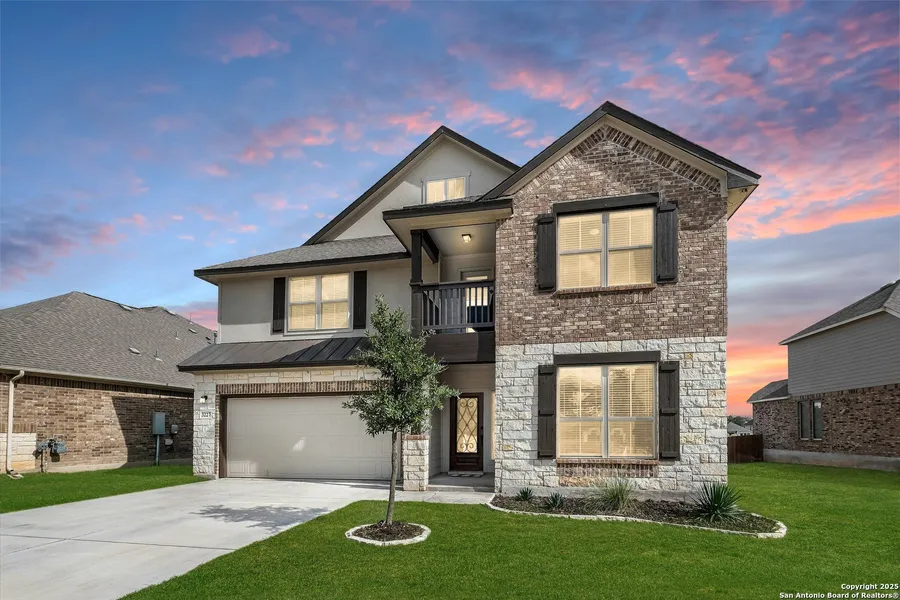 Welcome to 3227 Blenheim Park - the perfect place to call home in the beautiful Ventana community! This spacious 5-bedroom + 3.5-bath home offers plenty of room for everyone with an open-concept layout designed for everyday living and easy entertaining. The bright and airy family room with high ceilings flows right into the dining area and kitchen, creating a comfortable space where everyone can gather. The kitchen is the heart of the home, featuring granite countertops, stainless steel appliances, double ovens, an expansive island and ample cabinet space for all your cooking needs. Whether it's family dinners, weekend baking or morning coffee, this kitchen makes it all easy and enjoyable. The primary suite on the main level offers a peaceful retreat with a spa-like ensuite bath featuring double vanities, a soaking tub, separate shower and large walk-in closet. In addition, there's a private study making it easy to work from home or focus on projects. Upstairs you'll find a roomy game area with double Juliet balconies, perfect for playtime or a homework spot and a media room for movie nights. There are four additional spacious bedrooms and two secondary bathrooms offering space and versatility for family and guests. Enjoy evenings outdoors under the covered patio in the private backyard or take a stroll through the picturesque neighborhood featuring a community pool. This home also includes a two-car garage, energy-efficient features, water softener (2024) and modern finishes throughout. Located in the highly rated Comal ISD, and just minutes from shopping, dining, and schools, this home truly offers the best of comfort and convenience. With its friendly neighborhood vibe, parks and playgrounds nearby, Ventana is a great place to build lasting memories. With its thoughtful layout and stylish design, this home has everything you need and so much more!