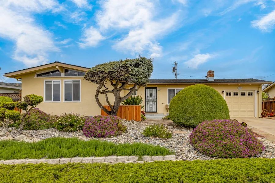 Presented for the first time on the market in over 50 years, this delightful single-story ranch home boasts charming curb appeal. As you step through the front door, you will appreciate mid-century modern touches, including high ceilings, exposed beams and bright garden picture windows. Lovingly maintained by the same family, this warm and cheerful property has seen various improvements over the years, feeling sparkling clean with newly-refinished hardwood floors and fresh interior paint. A spacious primary bedroom features ensuite bath, dual cedar-lined closets and hand-made stained glass accents. The sprawling backyard is an inviting space to relax and entertain, with beautiful landscaping, irrigation system, paver patios, meandering granite pathways, and access to garage with workbench and extra storage. Set back on a comfortable side street with generous sidewalks, the wonderful location affords close proximity to parks, schools, shopping and the beaches of the Monterey Peninsula.
