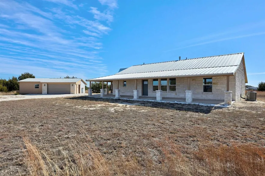 Discover your perfect retreat at 323 CR 229 in Briggs, TX! This stunning newly constructed home sits on 5 private acres, offering the ideal blend of modern comfort and peaceful contryside living. Featuring a charming stone exterior and a durable metal roof, this home is built to last. Relax on the expansive wraparound-covered porches, perfect for enjoying serene Texas sunsets. Inside, you'll find 3 spacious bedroom, 2.5 baths, and a dedicated office, providing plenty of space for family, work, and play. The beautifully designed home boasts stylish laminate and tile flooring, granite countertops, and a cozy gas log fireplace to warm up chilly evenings. Practical features include a detached garage with a 2,500-gallon water storage tank, ensuring convenience and peace of mind. Plus, low property taxes make this property even more appealing. Don't miss the opportunity to own this beautiful home and make it your own slice of Hill Country paradise! Schedule your showing today.