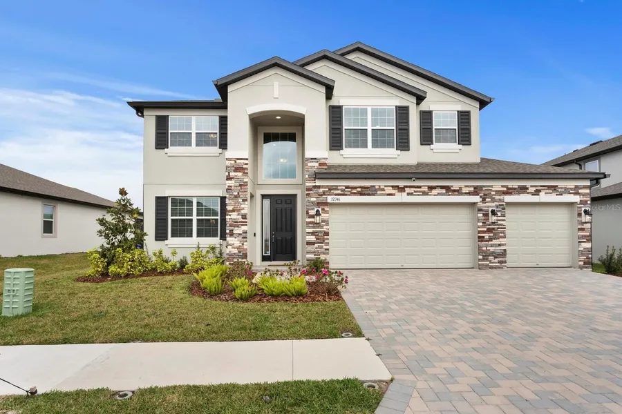 One or more photo(s) has been virtually staged. +++++++This brand-new, never-lived-in home, purchased in 2024, is a true masterpiece featuring over $140K in premium upgrades. Boasting 3,761 sq. ft., this stunning 5-bedroom, 5-bathroom residence is perfectly positioned on a picturesque waterfront homesite in the sought-after Epperson Ranch community. Thoughtfully designed for modern living, this 2024-built home showcases luxury and innovation, including wood plank tile flooring, a 50-amp car charger, a striking 48” electric fireplace, extra LED can lighting, tray ceilings, and a spacious 15x18 balcony. A Smart Home thermostat adds convenience and efficiency. The open floor plan includes two master suites (one upstairs, one downstairs), five full bathrooms, a private den/office, a large family room, and a massive bonus/media room with a pool bath that leads to the oversized screened lanai. The gourmet kitchen is a showstopper with sleek quartz countertops, stainless steel appliances, a large island with drop pendant lighting, double ovens, and a spacious butler’s pantry with custom shelving. A flexible space near the kitchen can serve as a formal dining room or additional office. Upstairs, you’ll find four generously sized bedrooms, a loft, and a versatile bonus room, perfect for movie or game nights. Step outside to your private backyard retreat featuring an extended screened lanai with breathtaking waterfront views, creating an ideal setting for relaxation and entertaining. Additional features include a three-car garage with epoxy-coated flooring, two automatic garage door openers, a 50-amp circuit for electric vehicle charging, pre-plumbing for a water softener, and reclaimed water for irrigation. Located in the highly desirable Epperson Ranch, residents enjoy access to the Crystal Lagoon, a 7-acre tropical paradise featuring swimming, kayaking, paddleboarding, a floating obstacle course, water slides, a rock-climbing wall, and a sandy beach. The community also offers a swim-up bar and Lagoon Café for refreshments. Conveniently located near top-rated schools, shopping, dining, and major highways, this exceptional property offers the ultimate Florida lifestyle. Don’t miss this incredible opportunity—schedule your showing today!