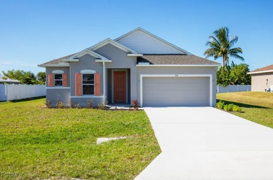 Welcome to The Drexel, a charming home nestled in the beautiful and vibrant community of Cape Coral, FL. Known for its sunny climate, scenic canals, and family-friendly atmosphere, Cape Coral offers a relaxed yet active lifestyle with plenty of outdoor activities, shopping, dining, and parks. This thoughtfully designed home blends elegance with comfort, offering everything you need for modern family living. Upon entry, the foyer leads you past the second & third bedrooms and bathroom, guiding you into the open-concept living space. The island kitchen, featuring an eating bar for casual meals, granite countertops, and shaker cabinets, flows seamlessly into the bright breakfast nook-a perfect spot to enjoy the morning sun. The inviting great room offers a spacious, open layout, with a den featuring double French doors, ideal for a home office or any space that suits your needs. The primary suite serves as a luxurious retreat, complete with a spa-inspired bath and a large walk-in closet. With 9' ceilings, a stunning Tray Ceiling, and ceramic tile flooring throughout, The Drexel is both beautiful and functional. Energy-efficient features, including Energy STAR qualified windows, low-emissivity glass, a smart thermostat, and Deako light switches, ensure year-round comfort. Step outside to the rear covered patio, perfect for outdoor relaxation. Additional highlights include architectural shingles, hurricane shutters, and an irrigation system to maintain your landscaping. The Drexel offers the perfect living space for anyone.