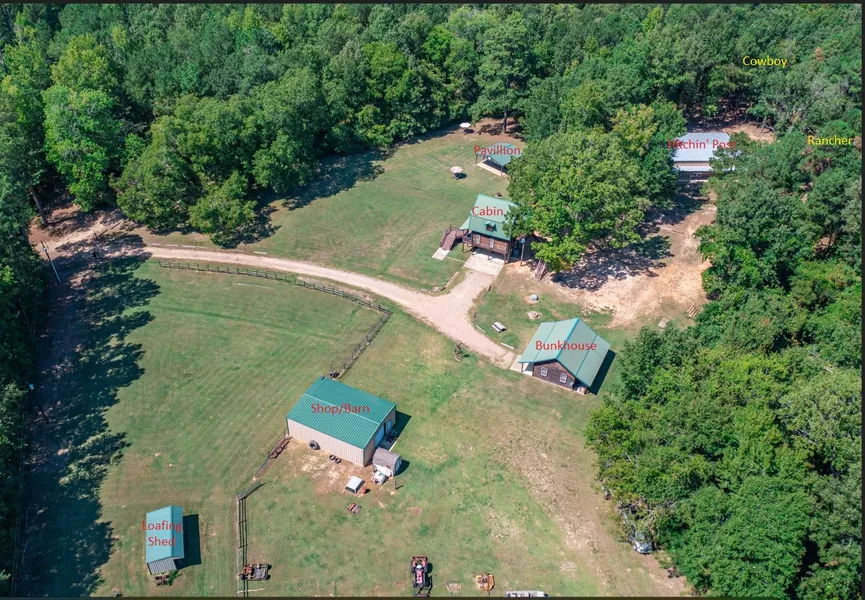 Four homes totaling 2574 sq ft of living space! Located on 19 acres of mostly wooded and rolling land with a seasonal creek, this is the gorgeous getaway to meet all your needs. Perfect for family reunions or summer vacations; or hunting parties with family and friends: or great for multi-generational or extended family households where all could be close and have separate living spaces. In addition, there is a covered pavilion, 30x40 shop or barn, 10x12 storage shed and a two-stall loafing shed. The 50x40 event building can be used for large gatherings or could easily be converted to additional bunk space. Move-in ready and fully furnished! See photos for details on the four living quarters and the event building.