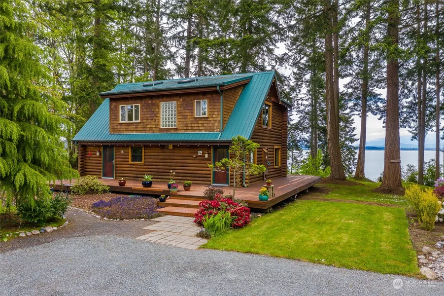 Perfect primary or vacation residence with no rental restrictions. This high bank waterfront log home with a restored expansive wrap around deck overlooking Skagit Bay, Mt Baker and sunrises. Two bedrooms in the main house, a full bath on the lower level, built-in dining nook, bar height counter, stone fireplace with gas stove insert, stairs to the loft overlooking the great room and a primary suite with a naturally lit bathroom. There is a large studio suite w/efficiency kitchen, 3/4 bath and covered view deck above detached two car garage. Includes a 1/2 bath and a studio and on demand hot water. 1.8 acre lot, has a raised bed garden, RV parking, private well, a spring and electric car charging. See remarks about steps to beach.