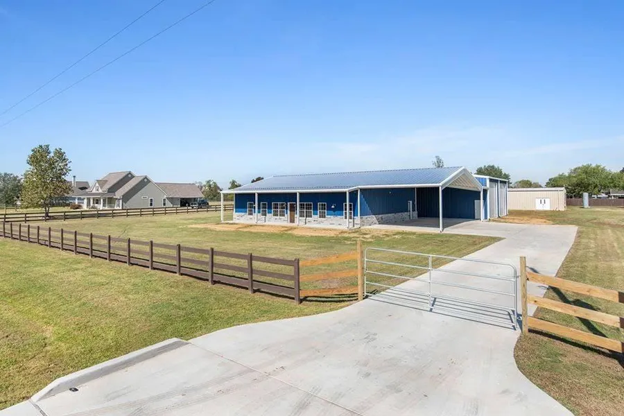 This home has it all! You will not want to leave this gorgeous 3-4 bed, 3 bath custom home on 1.5 acres with a coastal feel. Home includes luxury vinyl plank flooring, beautiful granite, lots of custom features throughout, Pex pipes, walk in closets in each bedroom, island kitchen with storage all the way around, and two primary suites. Office/Bonus room with walk in closet is used as a 4th bedroom. This amazing home is attached to a 2,000 SF Party barn/workshop/RV or boat storage with unbelievable breezeways & covered porches. Party barn includes full kitchen, full bath, push button glass roll-up door & concession window to serve without having to come inside. Enjoy entertaining family or guests in the backyard oasis by the pool. Property also includes a 1,500 SF metal storage building & automatic gated entrance. This property has everything you need & easy access to 290 & 99! Leave the big city and come enjoy life in the country. Hurry, this one won't last long.