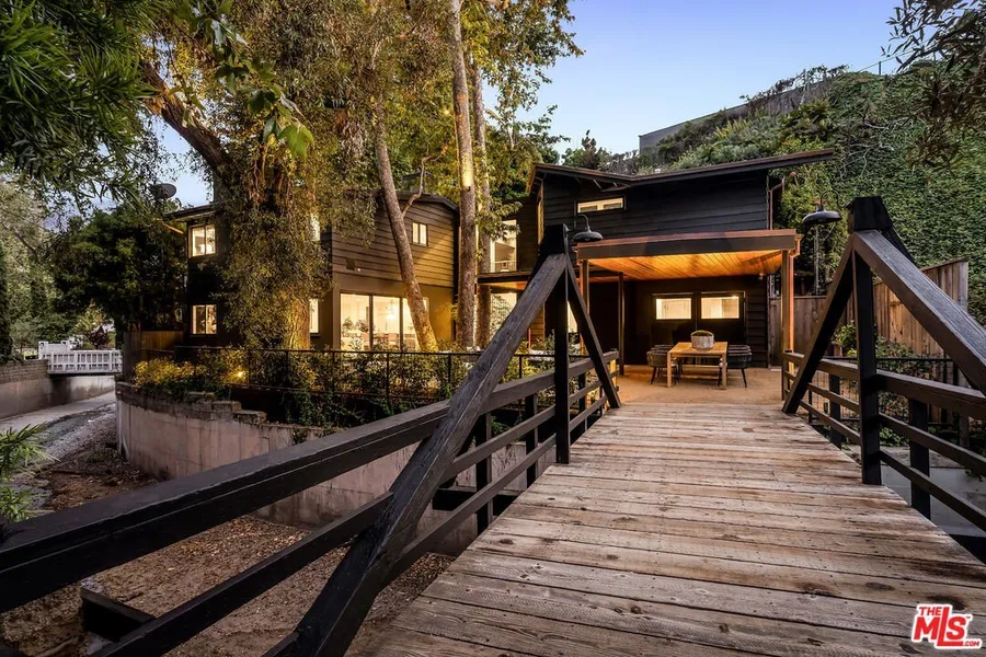 Tucked away in the idyllic enclave of Santa Monica Canyon, 327 E Rustic Rd is a 3-bedroom, 3.5-bathroom retreat with 2,834 square feet of thoughtfully curated living space. Extensively and tastefully renovated, the home was reimagined over the years in collaboration with Amber Interiors and architect Scott Prentice to blend organic elegance with elevated functionality. A 2022 renovation achieved a near-complete reconfiguration of the lower level and an expansion of the home's footprint. The result is a refined and inviting interior anchored by an open chef's kitchen featuring marble countertops, white oak flooring, custom cabinetry and top-of-the-line Wolf and Sub-Zero appliances. Oversized windows throughout bring in soft natural light and frame views of the canyon's surrounding beauty. Upstairs, two secondary bedrooms with en suite baths sit down a hallway from the serene primary suite, which features a spa-like marble clad bath with soaking tub, walk-in shower, dual vanities, hand painted terracotta floor tile, and a generous walk-in closet. A flexible open den once served as a fourth bedroom. Accessed by a private bridge and nestled alongside a creek, the property is surrounded by mature sycamores and soaring eucalyptus trees, offering both privacy and a deep connection to nature with easy indoor-outdoor living. An extensive landscape redesign added a flat grassy backyard, ideal for play, entertaining, or quiet reflection. Just moments from the beach, local restaurants, Canyon Square, and within the coveted Canyon Elementary School district, this one of a kind property pairs privacy, design pedigree, and location in one of LA's most treasured communities.