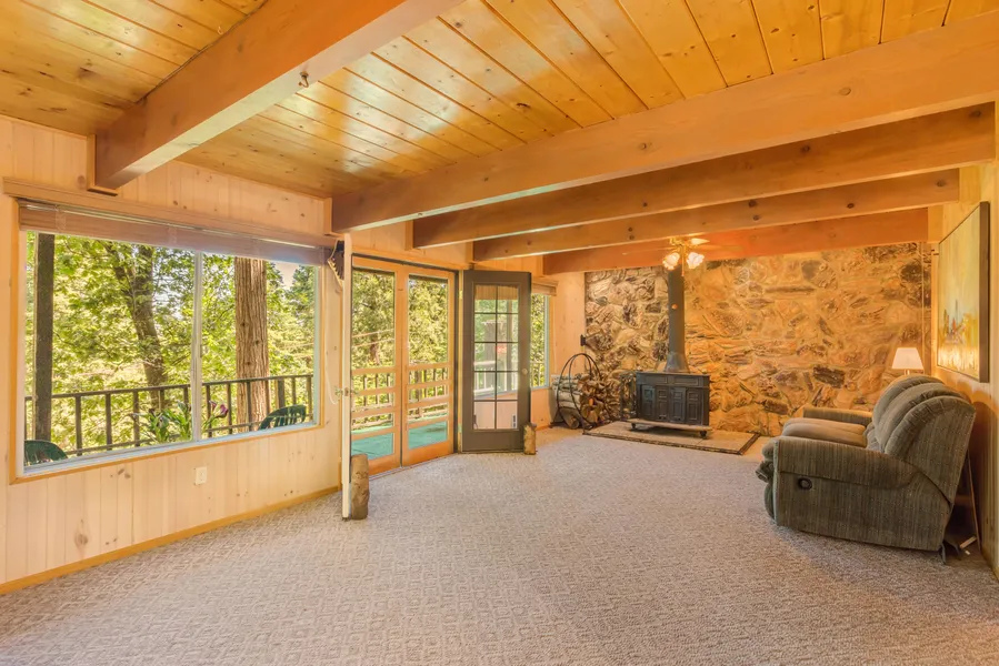The entry level of the cabin features a large main living area, functional kitchen and primary suite with attractive wood beamed ceiling providing the ideal space for someone with an eye for design and creativity to bring out its full potential. The heart of the home is the inviting living room with a wood burning stove and large windows framing panoramic vistas of the verdant, coniferous forest. Imagine cozy evenings spent by the fire enveloped in the warmth and comfort of this rustic haven. Open the doors to the private view deck and immerse yourself in the peacefulness of nature, and breathe in the fresh, crisp air as you soak up the awe-inspiring mountain views or the dark starry nights.
