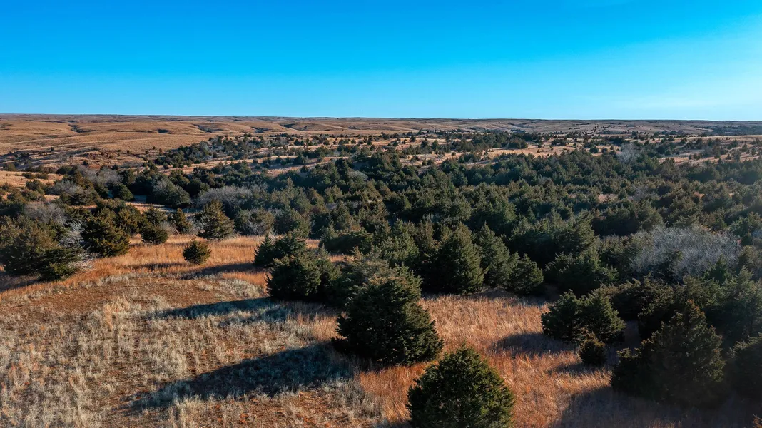 -Rolling scenic terrain with scattered cedars and heavy grass cover