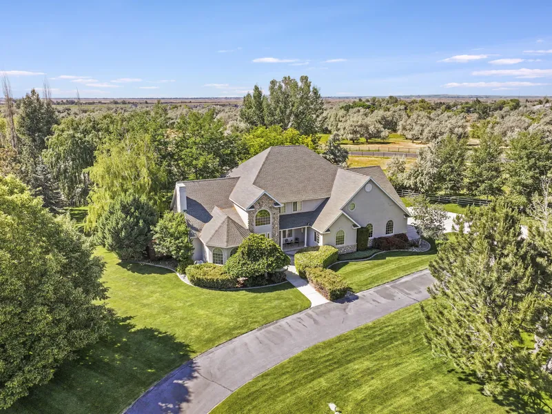 Located in a serene, gated community with 70+ acres of open space, seasonal community pastures & peaceful walking paths. This elegant home is surrounded by mature trees and backs to open pasture. Floor-to-ceiling windows frame stunning views and fill the great room with natural light, anchored by a striking river rock fireplace.