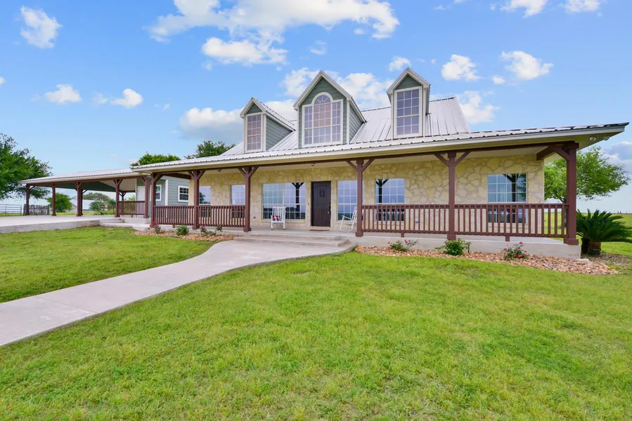 2,480 sq ft single story 3 bedroom 2 bath Hill Country style home with white limestone rock, German smear mortar, up-to-date paint colors and decorative gable trusses. A concrete sidewalk leads you to a wide front porch which spans the width of the front of the home, perfect for enjoying the expansive views of the rolling hills which span for miles. The unique "Mission style" front door welcomes you into the open living with large windows that usher in loads of natural light. The public areas are anchored by a floor to ceiling white limestone rock fireplace with natural cedar mantels. The large kitchen has fresh cabinets, new granite, new sink/faucet, new stainless dishwasher, new convection double oven with glass top range, and new over the range microwave. A long peninsula bar makes a perfect spot for breakfast or meals on the go. There is even a floor plug in the center of the kitchen if you choose to have a butcher block or island. Near the kitchen is the dinning area which connects seamlessly with the living area and overlooks the backyard.