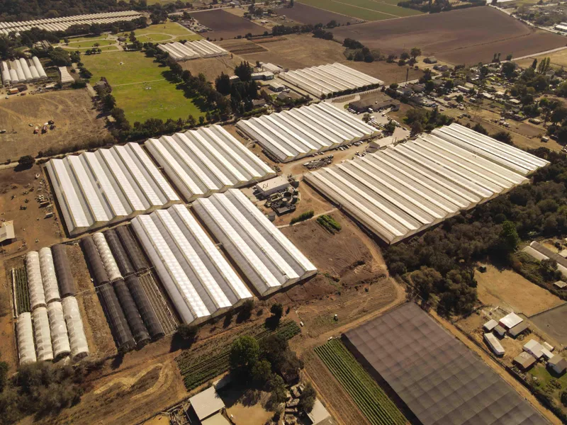 594,169+- square feet of steel and double poly greenhouses. Each range has concrete center isles. Houses have computer controlled top ventilation for humidity and temperature control