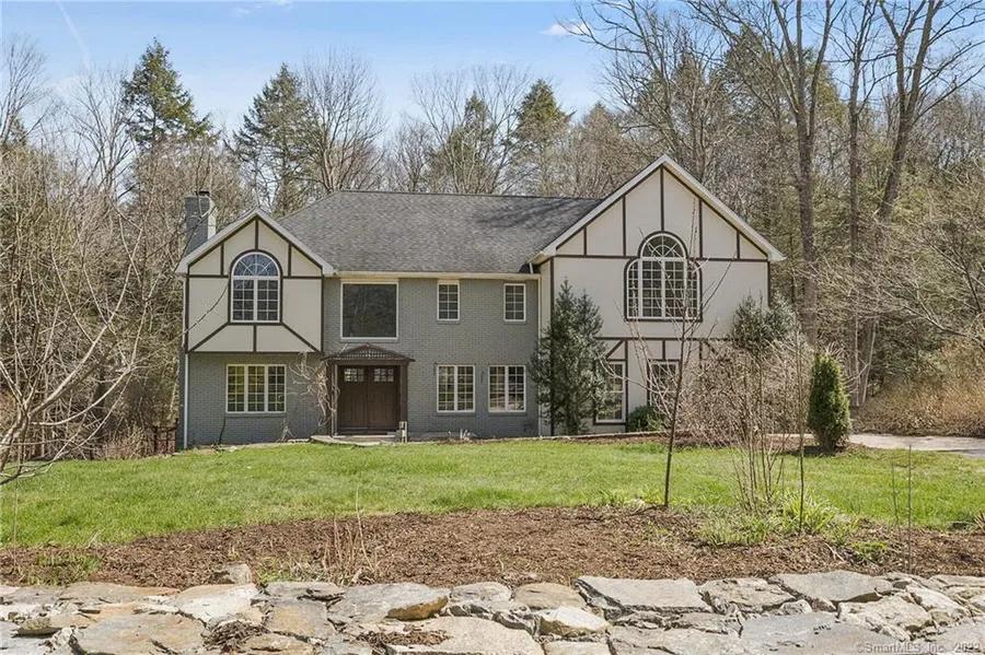Large and spacious Tudor/Contemporary styled home with intricately patterned brick/stone features including a guest cottage.Home is beautifully situated on nearly 2 acres of artistically landscaped grounds with waterfalls and Straddle brook hugging the property. As you enter the front double doors, you are greeted with a 2-story foyer staring into octagon shaped conservatory sunroom full of custom trim detail and sun-drenched windows. A family room/gathering area anchors the north side of the home featuring a masonry fireplace.The kitchen boasts ample counter space with quartz counters and distressed custom cabinetry looking into large family room with floor to ceiling windows and French doors leading to oversized rounded Trex decking wrapping around kitchen and sunroom. Generous sized bedrooms can be found upstairs along with an exquisite primary ensuite. The primary bedroom features a Juliet balcony and stunning cherry hardwood floors with large Palladian windows soaking in natural light. The primary bath is nothing short of a Spa experience. Thoughtfully positioned and designed: an extra-large roman shower, custom vanity and soaking tub offering views of the brook and sounds of waterfalls against the rocks creating the uttermost peaceful and tranquil atmosphere.