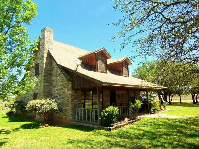 Delightful brick and cedar ranch house includes 82 acres and a 2,400 square foot barn. Custom knotty pine open concept interior has a nice flowing floorplan that offers 3 spacious bedrooms, 2 full baths, supurb gourmet kitchen, family sized dining room, comfortable living area with rocked fireplace, loft-office, utility mud-room, wet-bar, attached 2 car garage with automatic door opener, and covered porch and patio. Home is totally electric with co-op good quality drinking water. Many century live oaks, mesquite trees, great dove hunting when the birds cooperate. Wildlife known to be in the area: Deer, Turkey, Dove, Quail, and Hogs. Plenty of fresh air and wide open spaces make this a great place to live while enjoying the great outdoors.