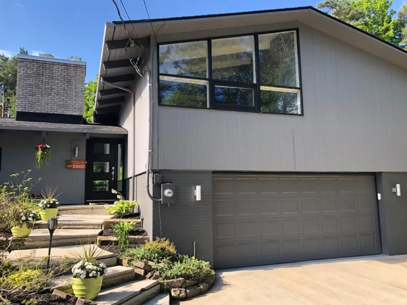 Rare find. One-of-a-kind mid-century modern in the heart of Pepper Pike. Walk through the front door and a magical view of the garden oasis and in-ground pool awaits. This light-filled gem sits on a 1.5 acre corner lot surrounded by mature trees and lush landscape. Enjoy your private oasis and yet be only minutes from area schools, shopping and dining. Post and beam architecture, acacia walnut floors, open sight lines and walls of glass feature throughout. Enjoy the stunning granite kitchen with ambient lighting, new GE Caf double ovens with wi-fi, Samsung gas cooktop, Subzero refrigerator and wine cooler. The south facing living and dining room is flanked by a wall of windows showcasing seasonal beauty throughout the year. Enjoy the convenience of the wi-fi remote gas fireplace in cooler weather. The adjacent family room with modern epoxy floors and half bath is the perfect place to catch a family movie. All three bedrooms boast tongue and groove vaulted ceilings and generous closet space. The primary suite enjoys gorgeous views overlooking the pool and features a built-in wardrobe and make-up area. The white granite en suite bath includes double vanities, glass shower, soak tub and matte black fixtures. A second bath features black granite shower and floor. Work remotely? Enjoy the distraction of the spacious and bright office area right off the pool!