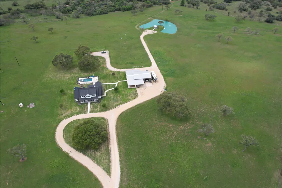 Absolutely beautiful property, rare find in the area. Has it all, gorgeous custom built home, fenced-in pool, shop, & stocked pond with a building with 1/2 bath. Every detail was attended to when creating this 1 of a kind home. The home has 5 bedrooms and 3 baths on the first floor and a bonus space and extra large bedroom and bath on the second. 2 on demand gas water heaters, custom and electric shades, 8' doors, 2 water wells, acres of irrigated carpet grass, 2 septics, buried 500 gallon propane tank, commercial water softener are a few of the extra touches that make this place amazing. Smart features throughout the home. The immaculate shop with 1/2 bath has parking for several vehicles plus toys and still plenty room for entertaining. The pool and hot tub are both gas heated as well as the firepit. Cool decking around the fenced-in pool. Outdoor patio includes a gas fireplace, flat top grill and pellet grill. 2 hrs to SA, Houston, Austin, or CC! ADDITIONAL 80 ACRES ARE AVAILABLE!