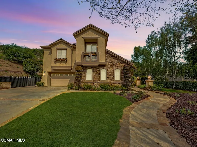 *Sellers will consider buying down the interest rate by 1% for first year using our preferred lender.* Welcome to 331 Briar Bluff Circle--a gorgeous 4-bedroom, 4-bath home located on a quiet cul-de-sac with a main floor dedicated office (next to a closet and full bathroom), built in 1999 and lovingly maintained by its original owners. Set on over an acre in the scenic hills of Thousand Oaks with a level main front and backyard, this 3,608 sq ft home offers exceptional indoor-outdoor living with lush landscaping, flagstone hardscaping, garden lighting, a resort-style pool and spa, outdoor kitchen with built-in sink, grill, storage, refrigerator and bar-top umbrella seating area. The upper tier includes a sunset-view patio overlooking Thousand Oaks, play yard, and horseshoe pit--ideal for entertaining or future expansion such as an ADU or sport court. Back down the flagstone steps to the backyard are 3 patios-1 large patio attached to the home with a patio cover over a dining space and outdoor family room. The other 2 patios are attached to the pool and elevated spa deck-one with a fire pit. These areas are enhanced with gated side yards with an arched vine covered walkway through a topiary and rose garden and a gated side yard perfect for pets. And not to miss the vine covered gazebo in the front yard -perfect for gazing at the unobstructed sunsets. Inside, enjoy wide-plank hardwood floors and newer carpet on the main floor with a formal dining room open to a light and airy living room with tons of windows, a roomy open concept kitchen with granite countertops, large island, upgraded cabinetry, large built in ovens, butler's pantry with wine refrigerator, open to a another spacious dining area and family room with a gas fireplace next to a laundry/mud room conveniently located by the garage and door to the side yard. Upstairs are 4 generous bedrooms (2 bedrooms with walk-in closets) with a large loft area including a double linen cabinet and 3 elevated styled full bathrooms. The huge, luxurious primary suite with a sitting room over looks a gorgeous backyard and includes 2 walk-in closets next to a new spacious, well appointed bathroom with large stone tile throughout, new vanities with quartz countertops, a large walk-in shower with glass surround, a deep soaking tub all with updated lighting and bathroom hardware. 10 and 15 foot ceilings throughout the home with framed windows in main areas and primary spaces along with sleek crown molding. Thoughtful upgrades like a Ring doorbell and cameras, a security system, battery back-up automated garage door opener and assumable lease solar panels ($204/mo., cuts bill down to zero) enhance comfort and efficiency. Every interior room has had renovated touches! Bordering Wildwood Park trails and open space, this one-of-a-kind home blends privacy, elegance, and everyday convenience.