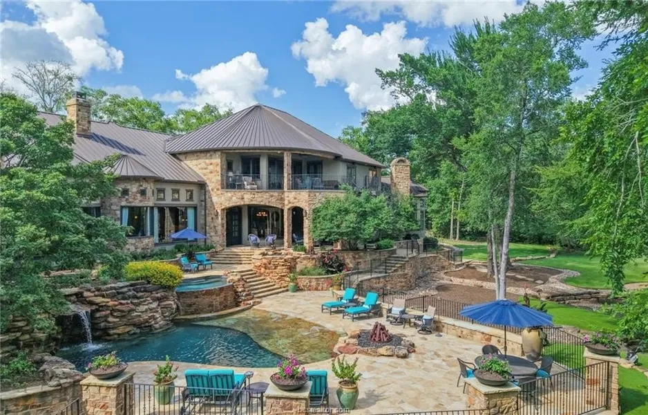 This custom estate sits on a rare 1.4-acre wooded lot backing to the Traditions Golf Course in Bryan. Designed with luxury, privacy, and entertaining in mind, this 7,720.5 sq ft (per CAD) home features 6 bedrooms, 6 baths, 3 half baths and 6 fireplaces, including a stunning pass-through fireplace in the main living area. Enjoy the flexibility of two primary suites, ideal for multi-generational living or hosting guests in style. Dual laundry rooms—one on each level—provide added convenience. Two dedicated offices—one with vaulted ceilings and fireplace, offering an impressive workspace; the second, a more intimate office for quiet study. Soaring curved glass windows surround the dining and bar areas, creating a striking architectural statement. Entertain with ease in the fully equipped bar and wine room, or unwind in the private home theater. A chef’s kitchen features GE Monogram appliances, double ovens, dual dishwashers, warming drawers, and copper sinks. Outdoor living is a showstopper—with putting and chipping greens that bring the golf course to your backyard, alongside a zero-entry pool w grotto, dual spas, custom rock waterfall, and multiple fire pits. The outdoor kitchen, fireplace, and spacious covered patio make this the ultimate backyard retreat. Additional highlights include a 2023 metal roof, central vac system, two upper-level balconies, & luxury finishes throughout. A rare opportunity to own a legacy property in one of Aggieland’s premier communities.